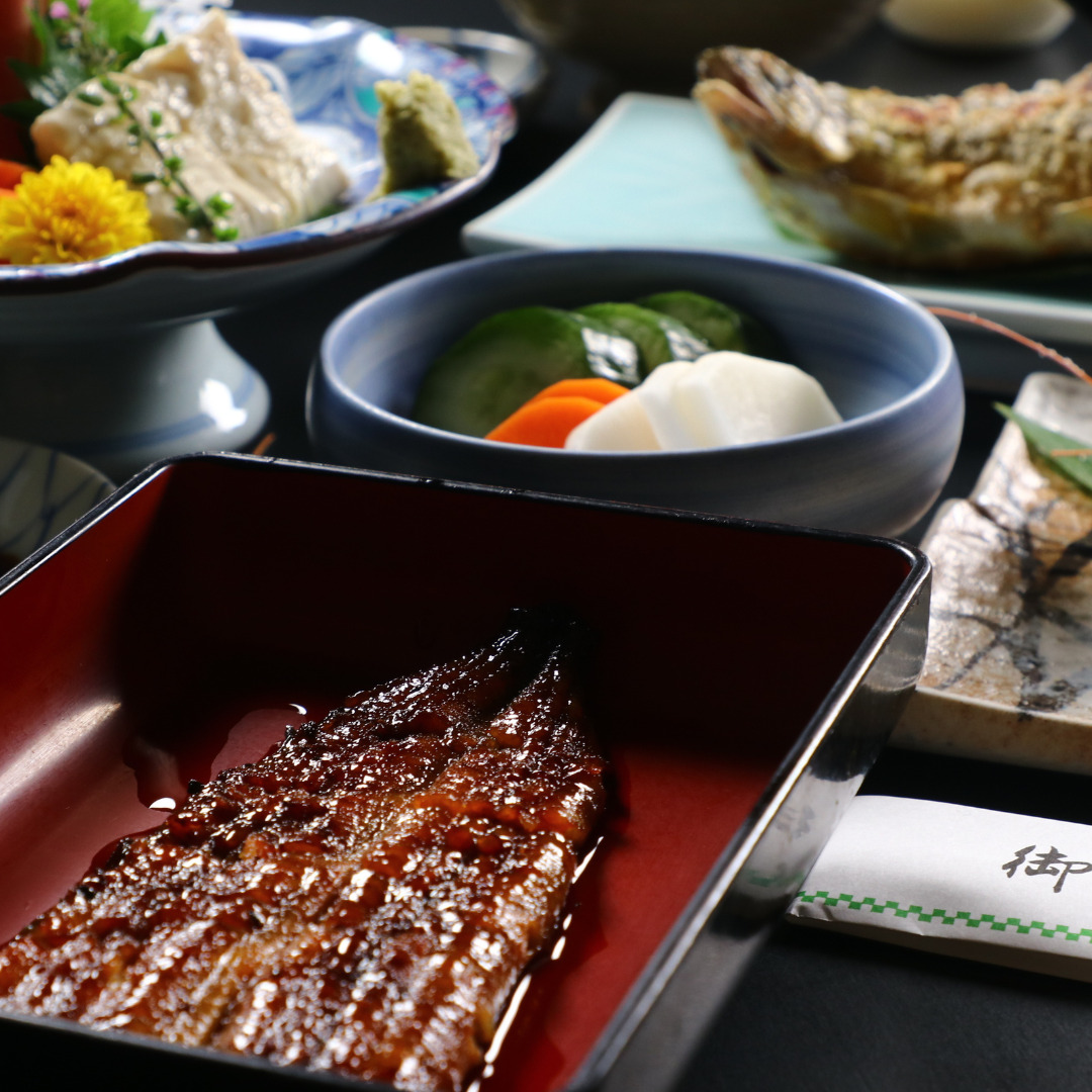 この宿を代表する一品が、50年以上継ぎ足してきた秘伝のタレで焼き上げる鰻の蒲焼き。