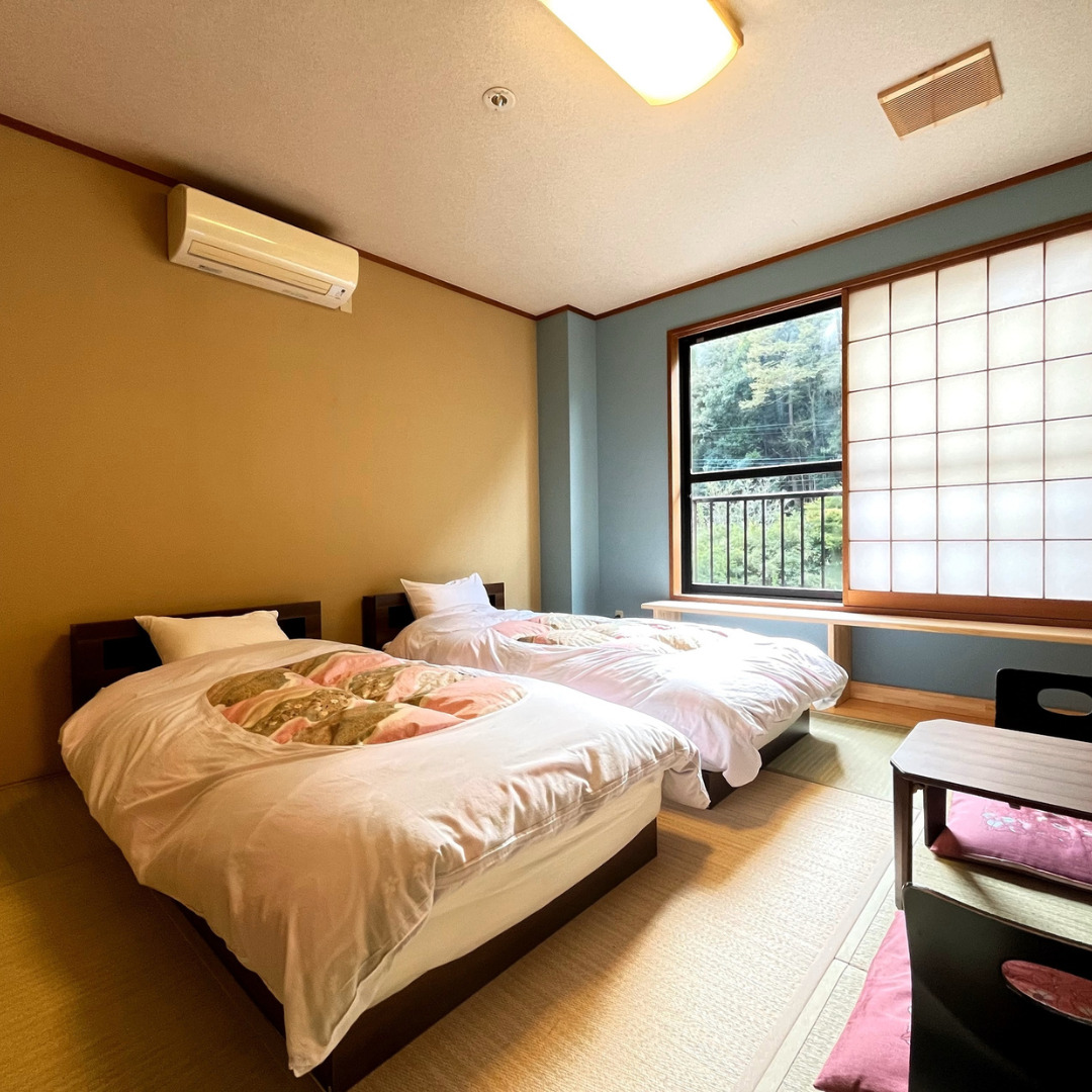 全室が川に面しており、窓の向こうにはゆるやかに続く川の流れと、季節ごとに表情を変える山の景色。