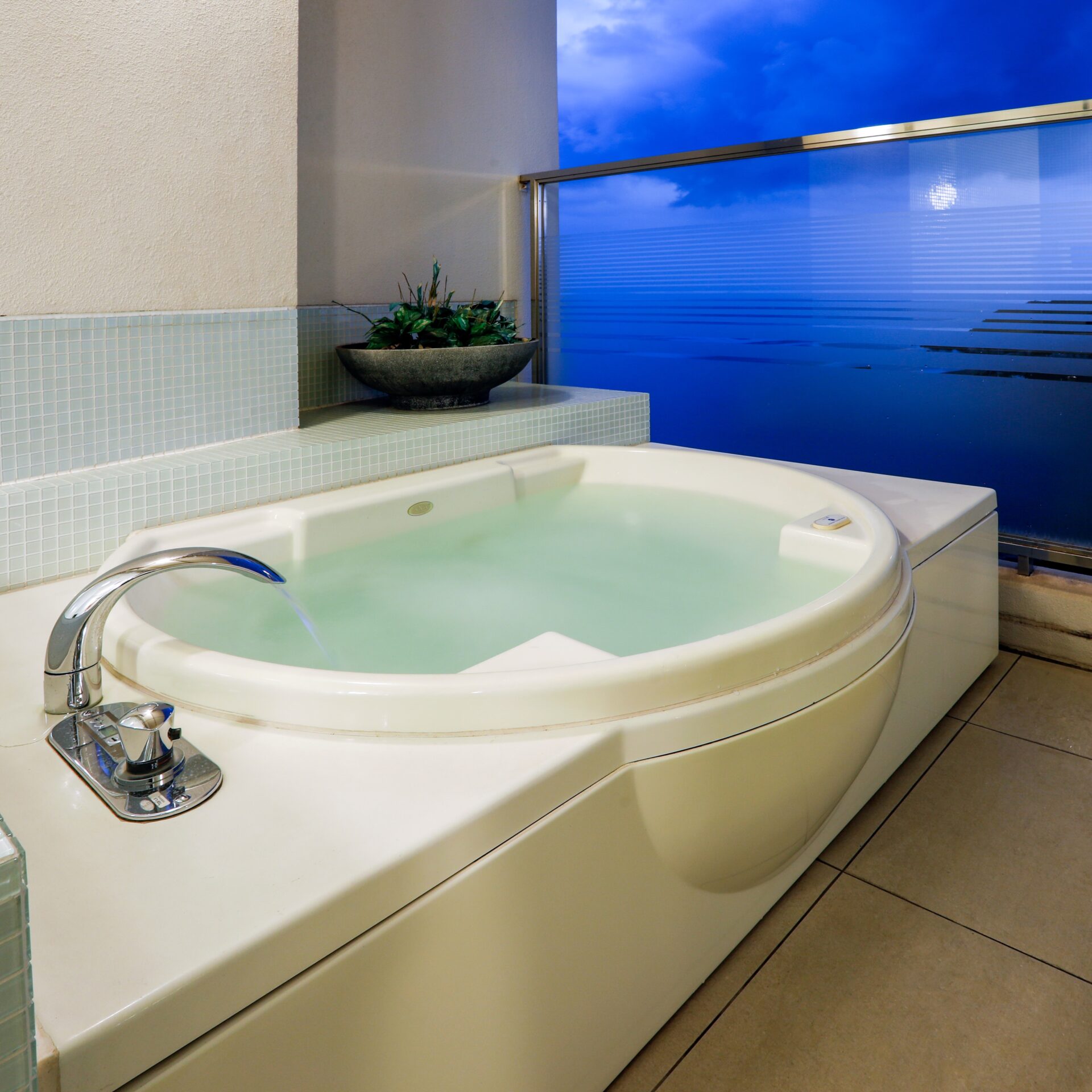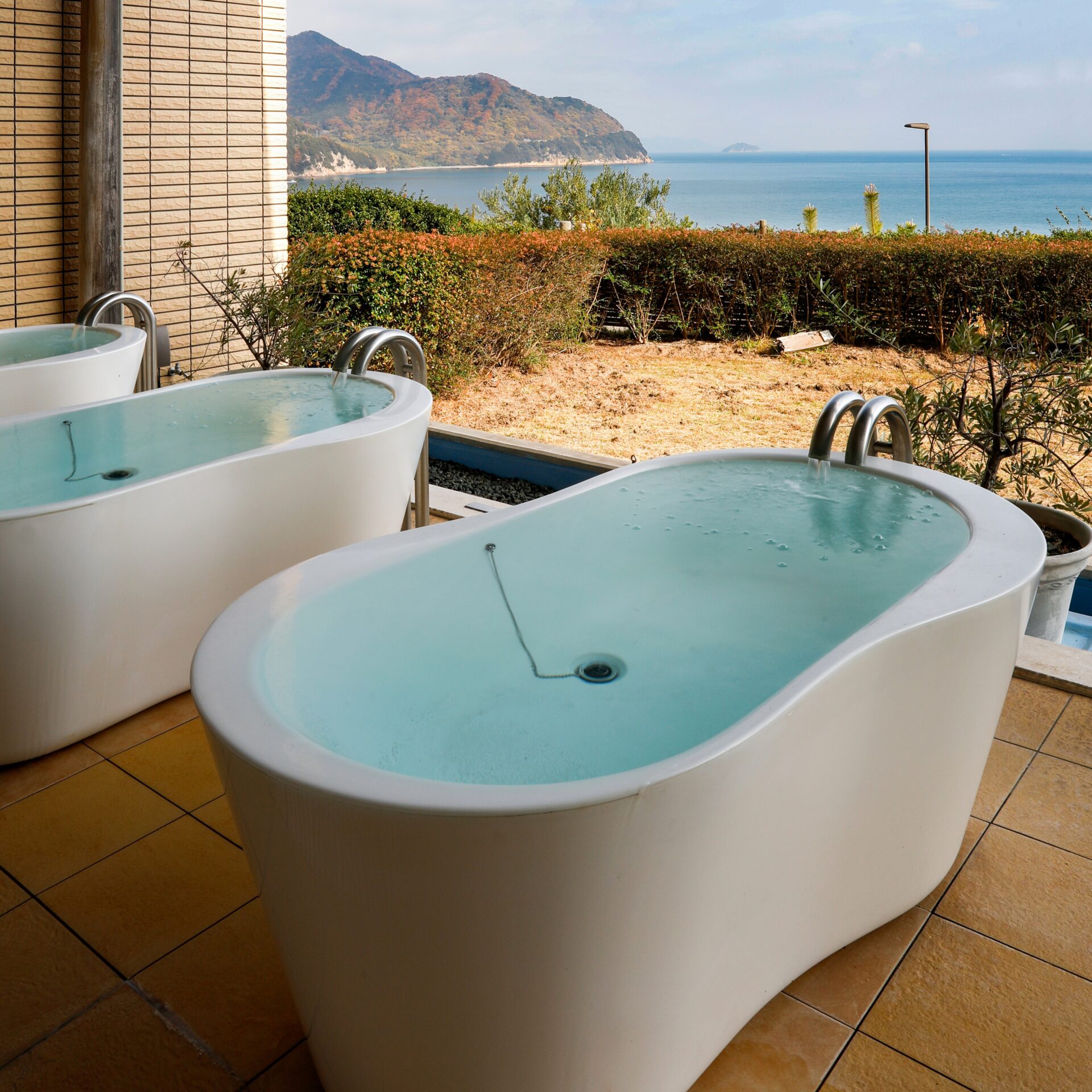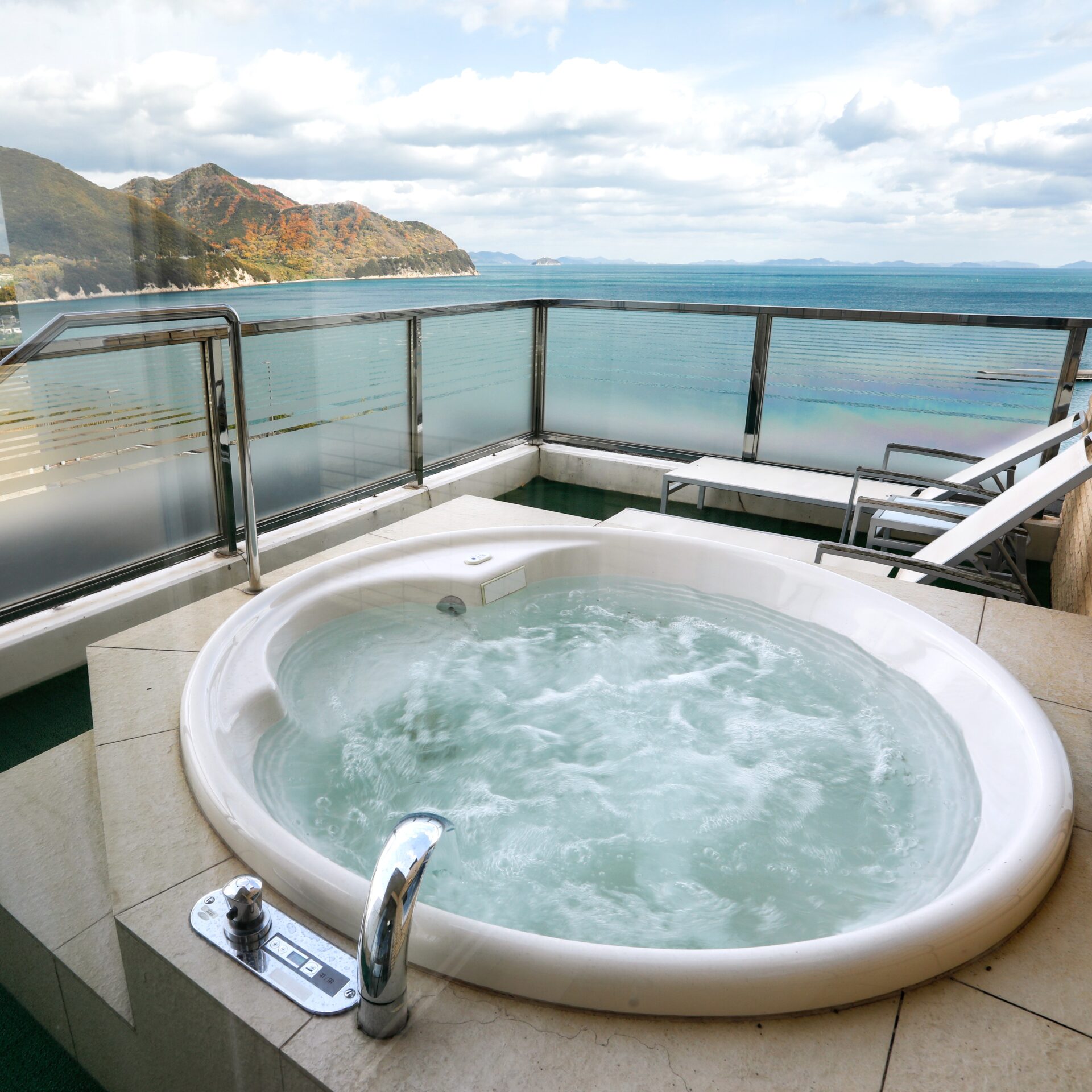 「インランド・シー・リゾート フェスパ」では、すべての客室にジャグジー付き露天風呂を備え、海を眺めながらゆったりとした時間を楽しめます。