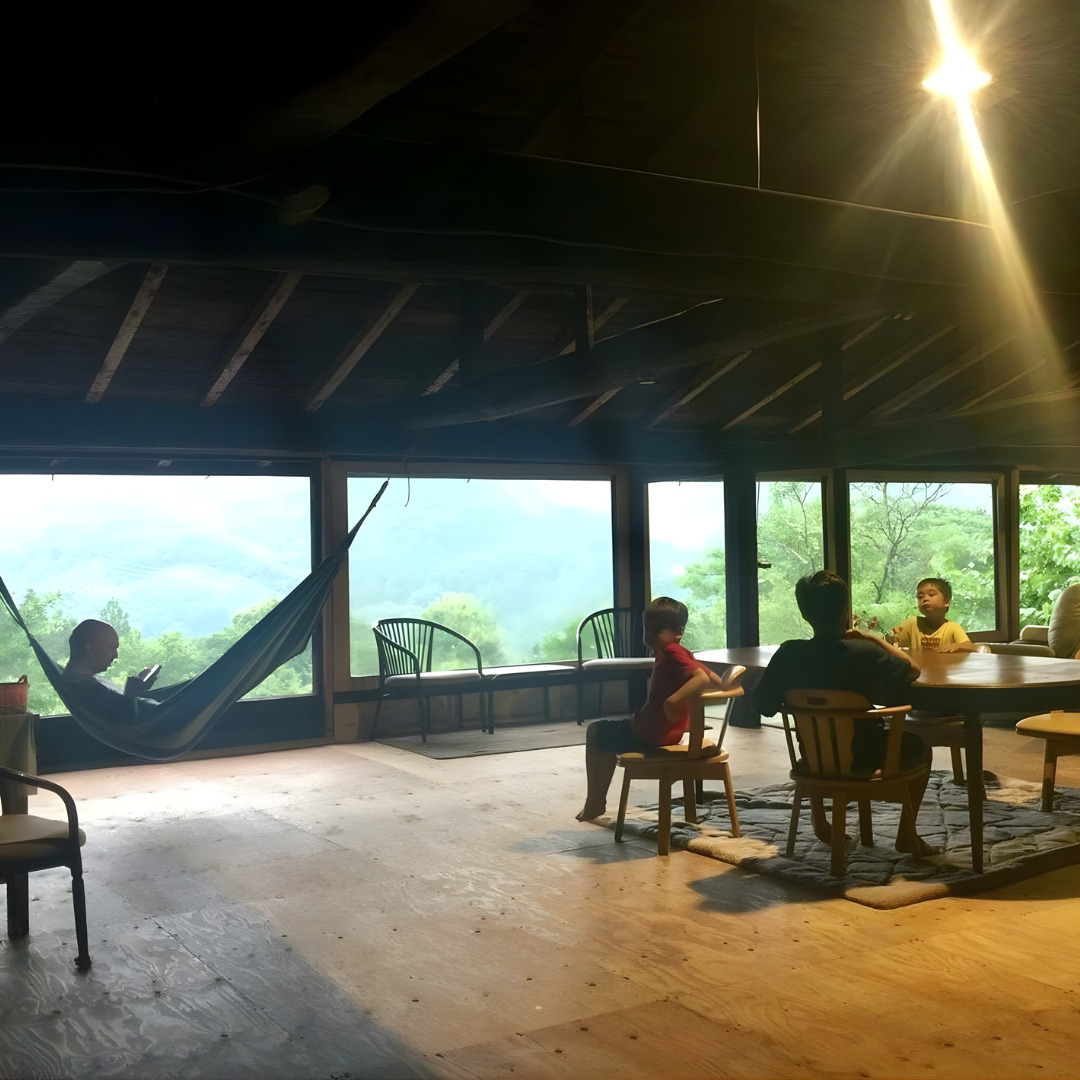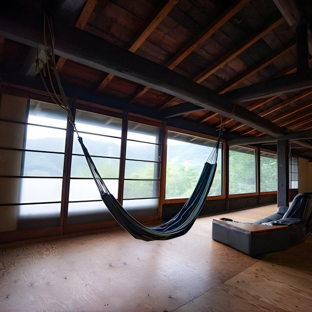 2階からは四季で表情を変える山々、さらに榛名山を望むことができます。 運が良ければ、吾妻川から立ちのぼる蒸気が雲となり、ゆっくり形を変えながら 流れていく“生きている雲海”を眺められます。 ハンモックに身体をゆだねて眺めるだけで、時間の流れがひとつ緩やかになります。