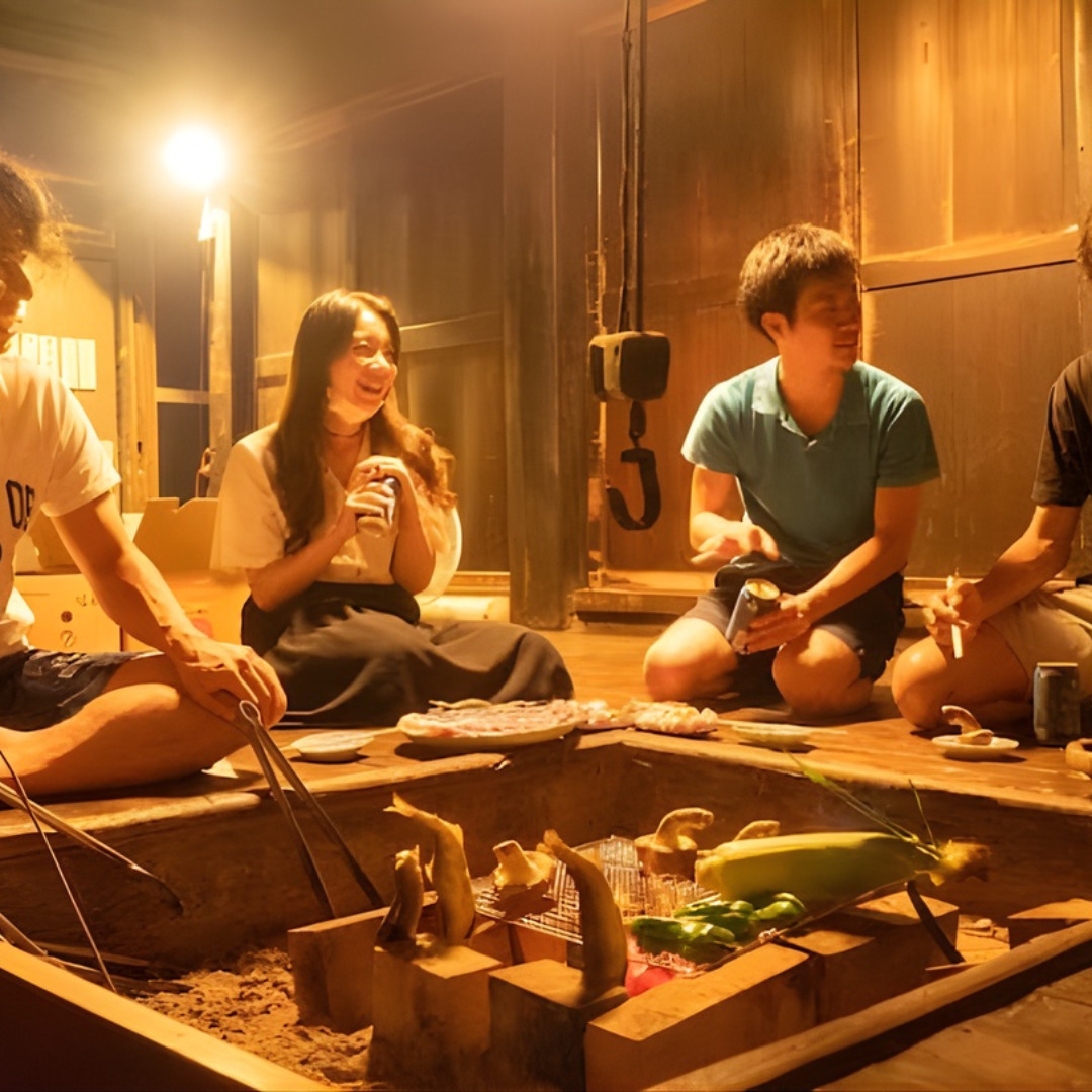 旅のウォーミングアップは、草津温泉の街歩きから。 足湯に入ったり食べ歩きをしたり、盛り上がったテンションのまま宿へ。 到着後は、スーパーや道の駅で買い込んだ食材で囲炉裏BBQ。 「誰が焼くのが一番上手いか」なんて話で笑いながら、火を囲む時間が盛り上がります。 夜は2階の大空間で“合宿みたいな夜”を。 プロジェクターで思い出の写真をスライドショーにしたり、 Netflixで映画を見たり、語り疲れるまで夜更かししたり。 ホテルとは違う、「みんなで同じ空間にいる時間の楽しさ」がここにはあります。