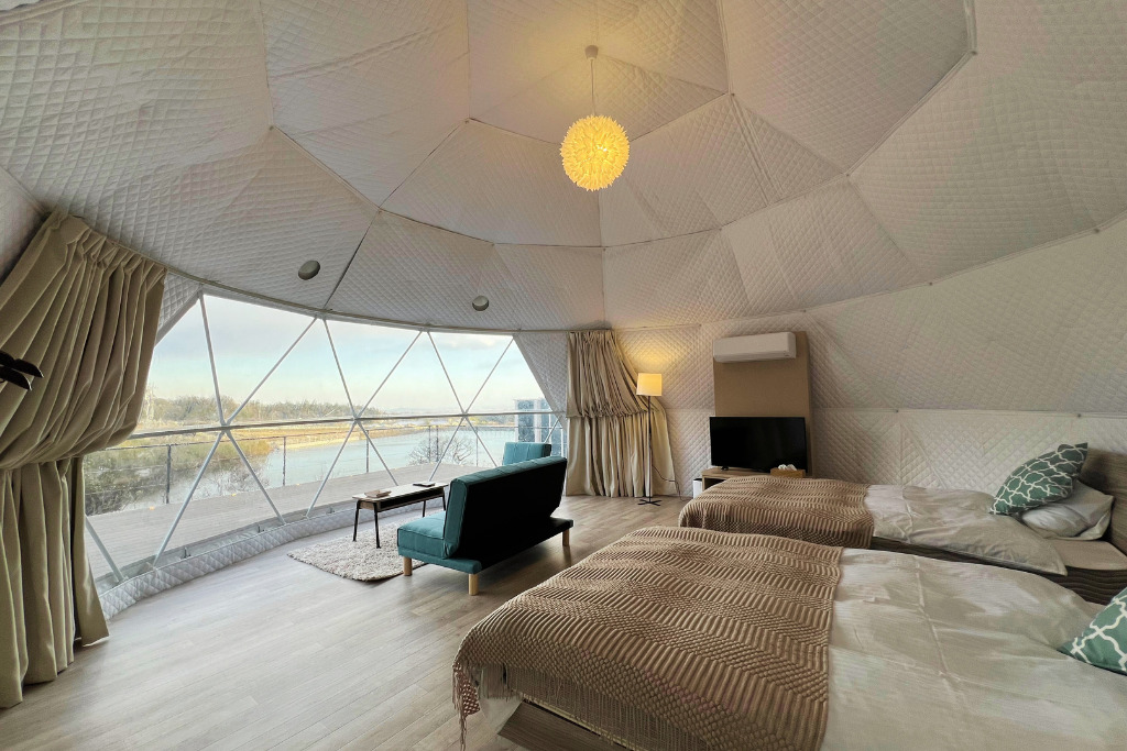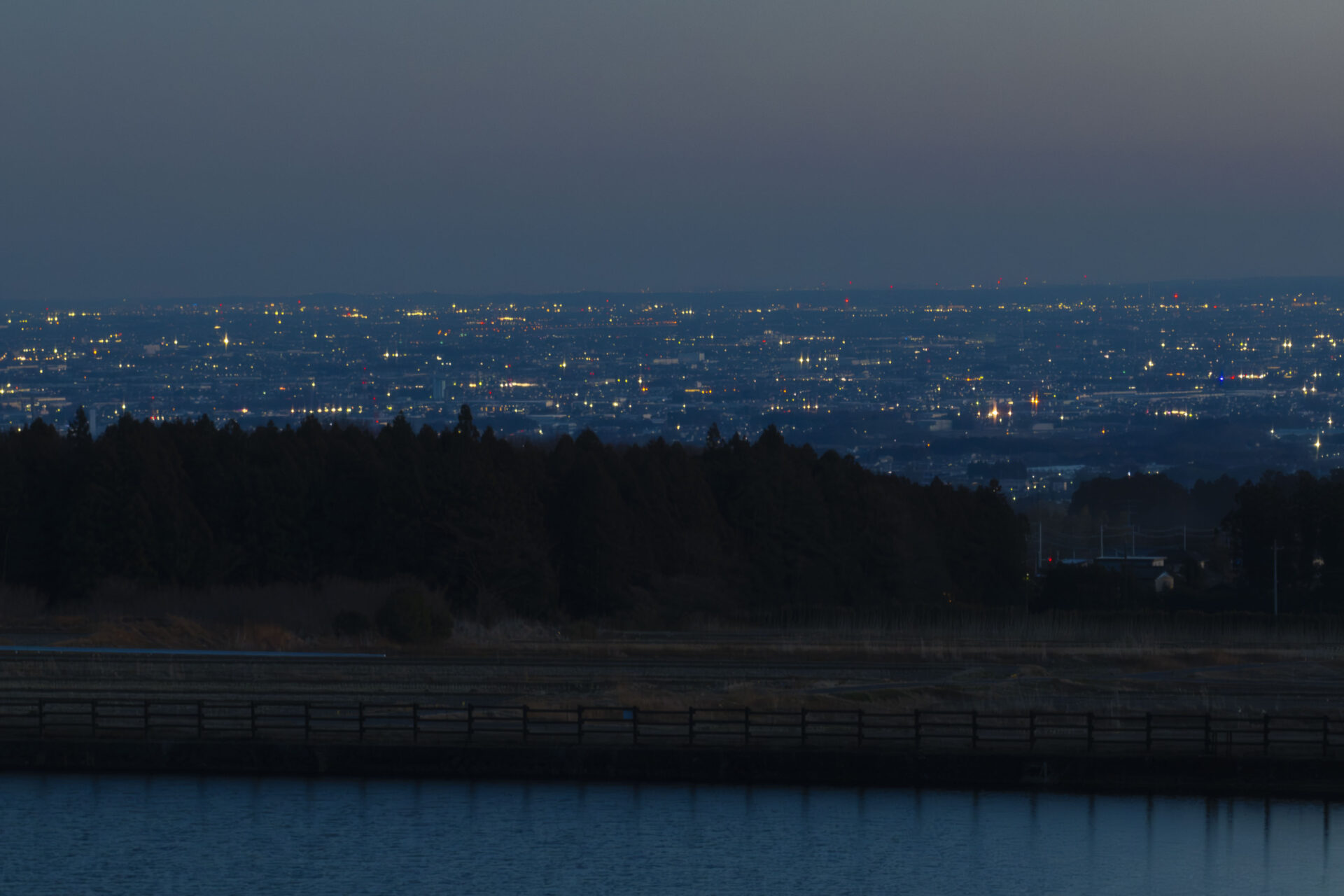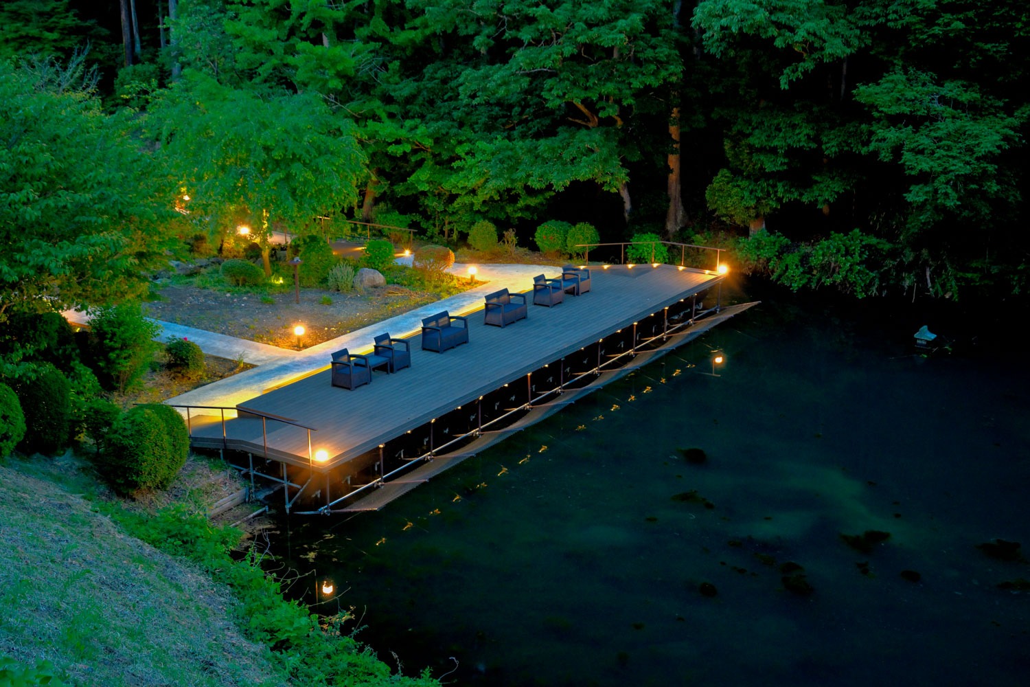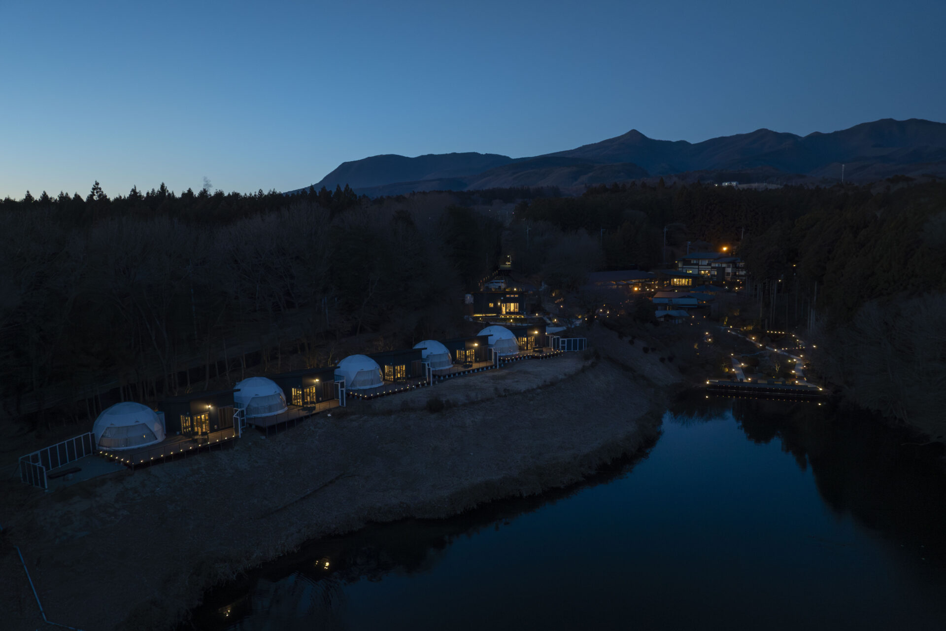 大人のための温泉グランピングです。目の前に広がるのは、原沼の水面と関東平野の夜景。