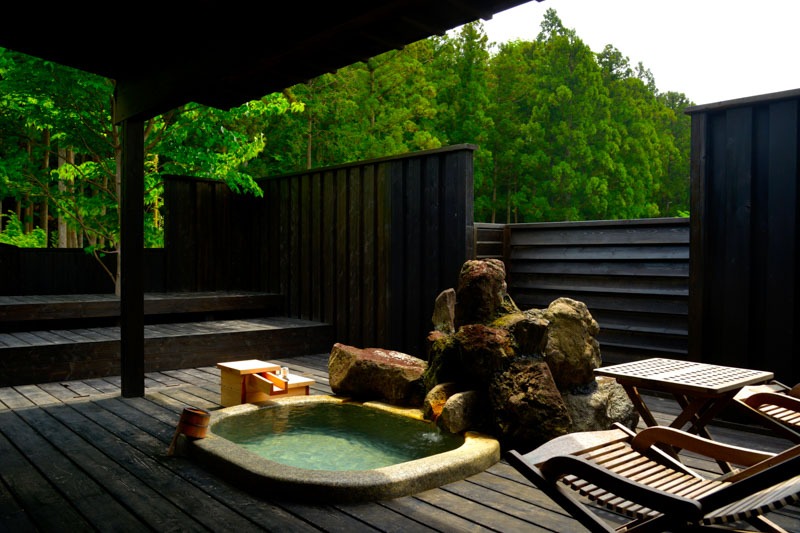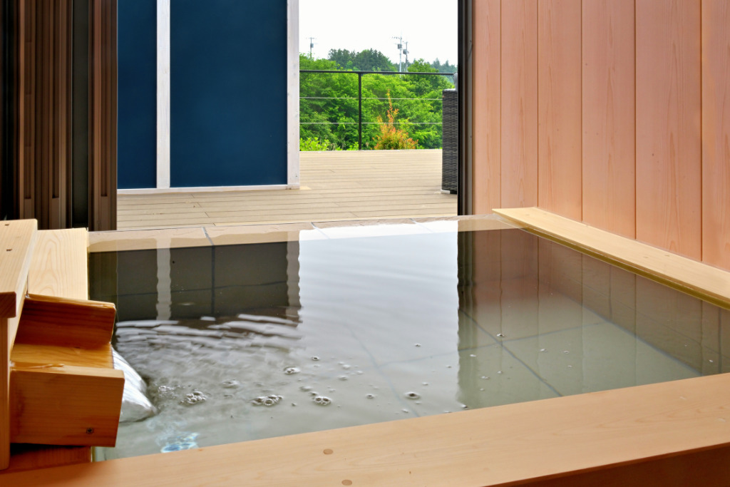 景色と一体になるような湯あみの時間が広がります。Bluetoothスピーカーで好きな音楽を流しながら、