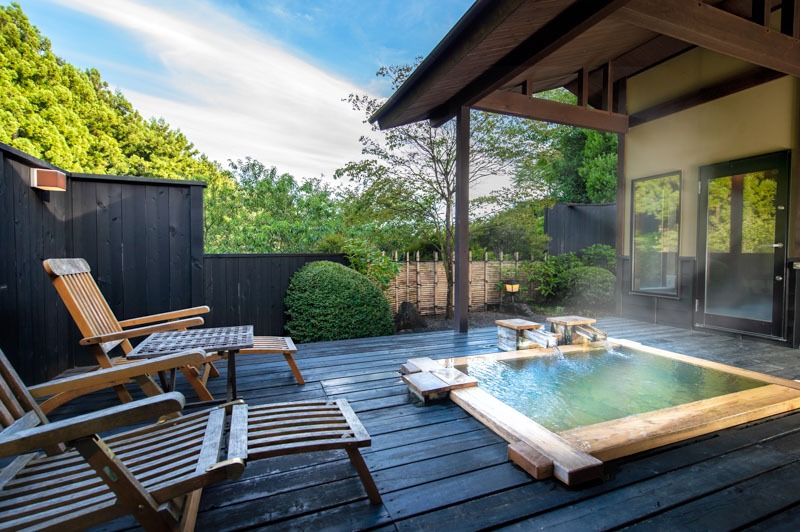 5000坪の敷地に、本館・別館・離れなどが点在する和モダンの空間です。すべての客室に露天または半露天風呂を備え、