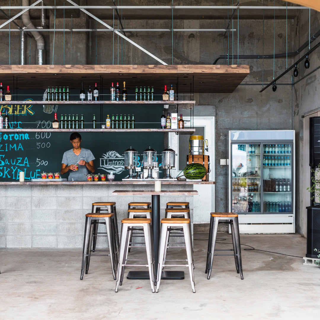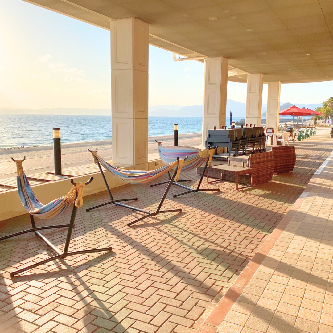 海沿いに面したエントランスには、心地よい潮風を感じながら寛げるハンモックやテラス席が並びます。到着した瞬間から、目の前に広がる海と夕陽が迎えてくれる特別な場所です。