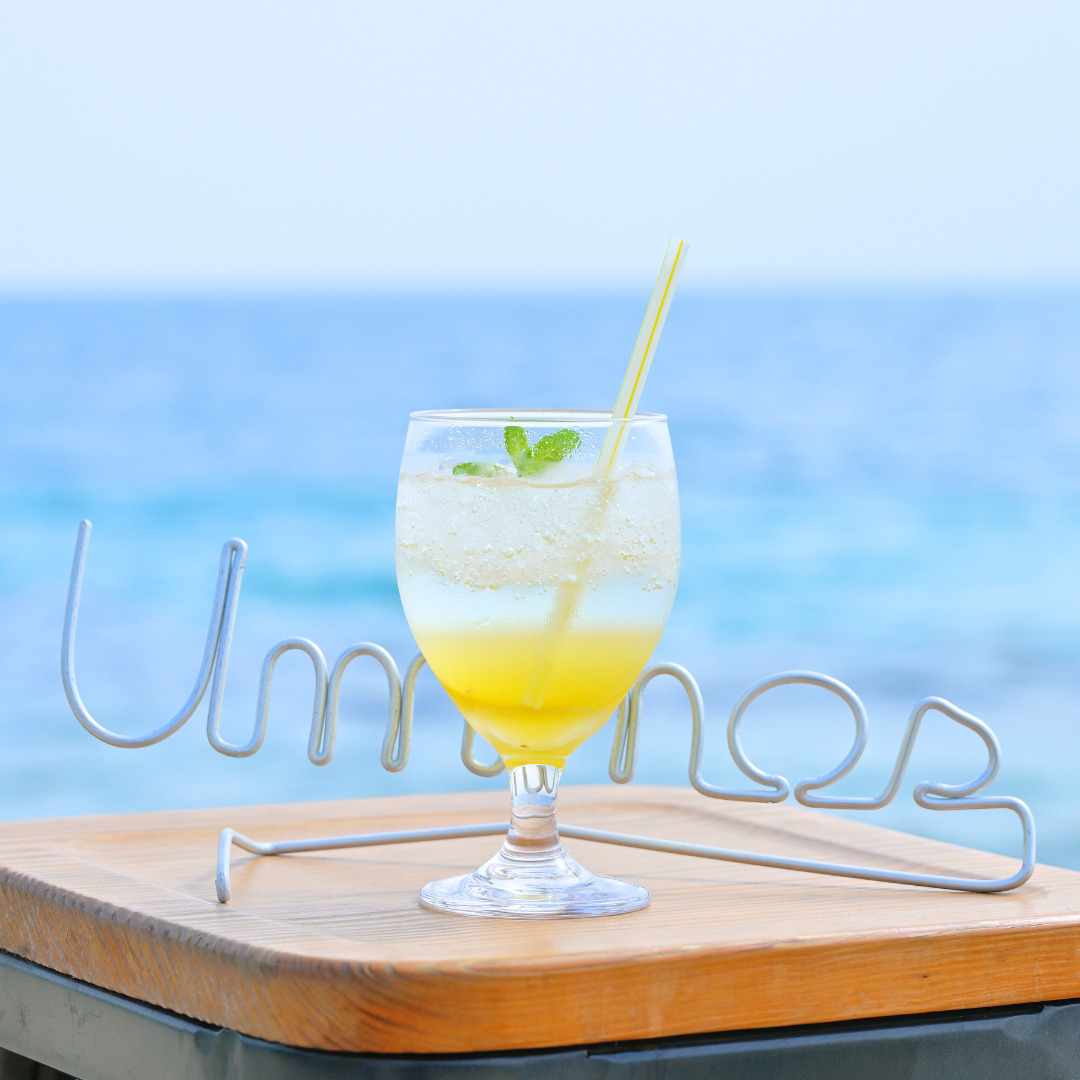 海を望むテラス席が特徴のサンセットカフェ。波の音をBGMに、刻々と変わる空の色を眺めながら過ごす時間は、まさに非日常。おすすめはホテルオリジナルの「uminosレモネード」。爽やかな酸味が、海風とともに心地よく広がります。