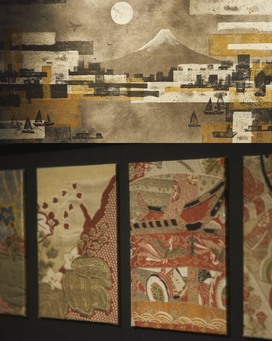 「倉(Kura)」をモチーフに設計された館内には、蔵道具、西陣織、古伊万里など、和の意匠と現代アートが融合。