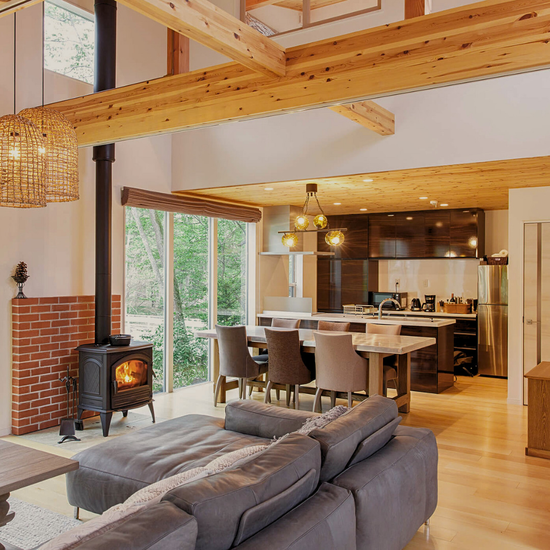 木張りの外観は南軽井沢の自然と調和し、室内は天然木の温もりとミニマルな美しさが共存。