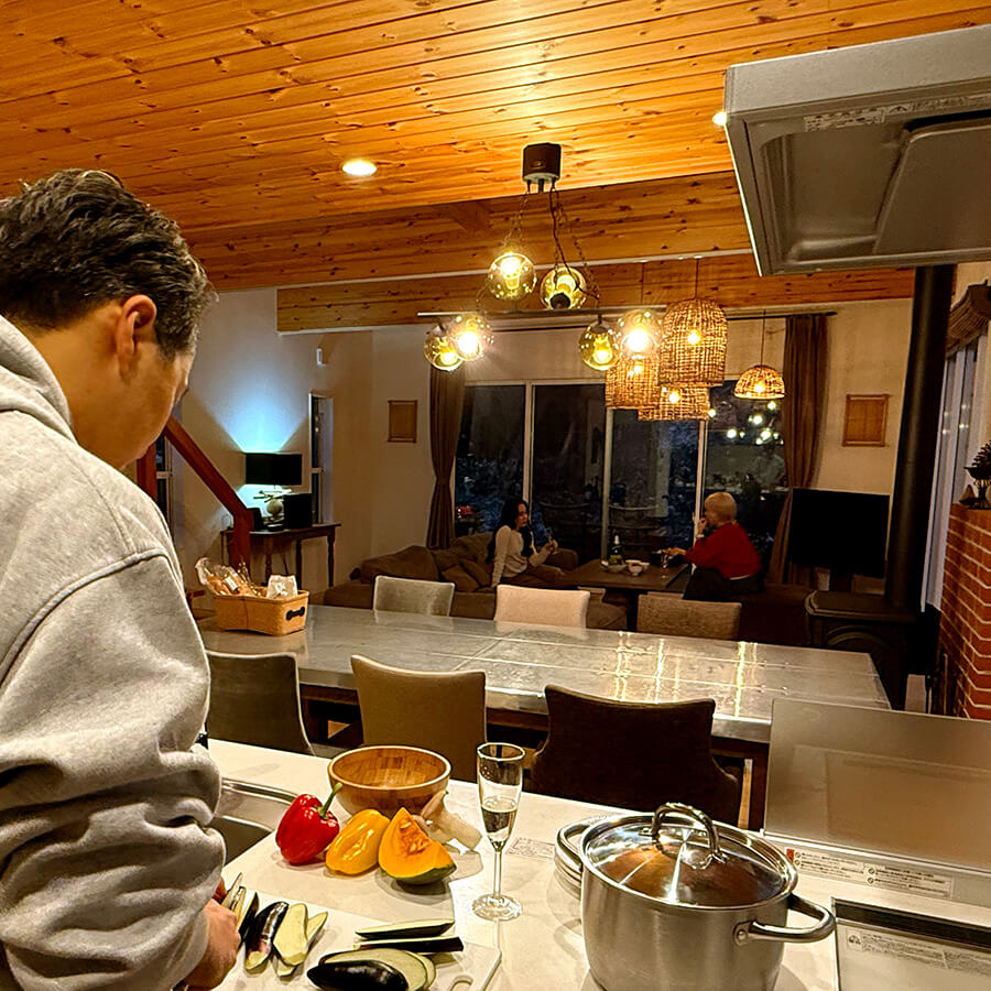 夕方からは、いよいよBBQタイム。屋根付きのテラスに設置されたガスグリルで、天候を気にせず快適に調理が楽しめます。開放的な空間で、仲間や家族と乾杯しながら、軽井沢の味覚を囲む時間は格別。