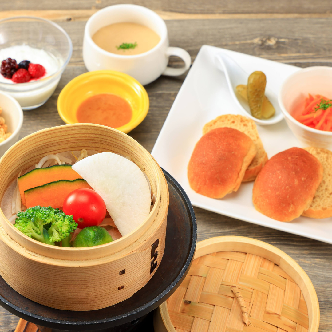 朝食は、季節の野菜を使ったせいろ蒸しに、自家製パンとスープを添えて。