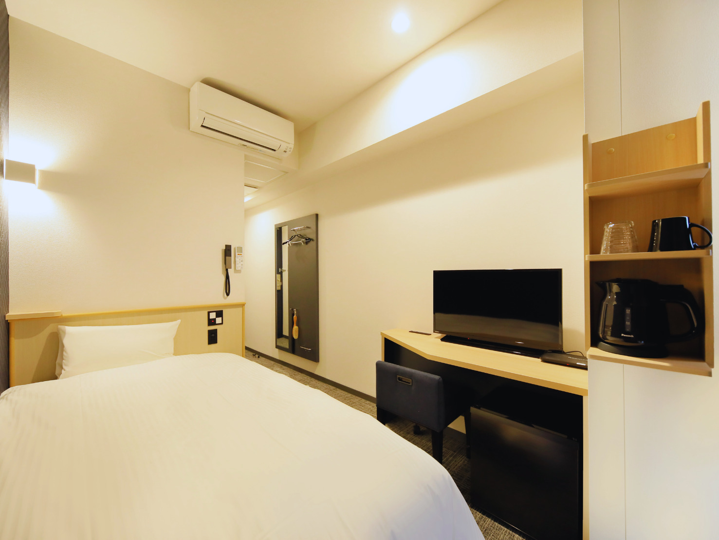 コンパクトな客室でも快適性を高める工夫が随所に見られます。“必要なものを、必要な分だけ”。