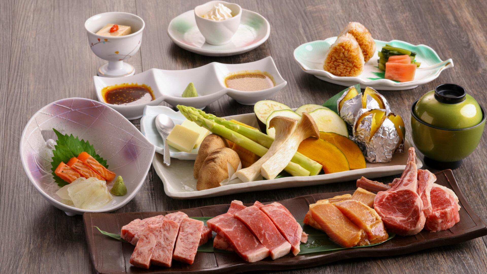 お肉と野菜は2名様分でのご提供となります。現在は焼おにぎりではなく、釜飯(白米)をご用意。