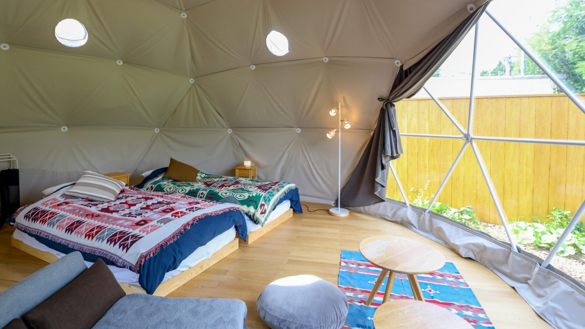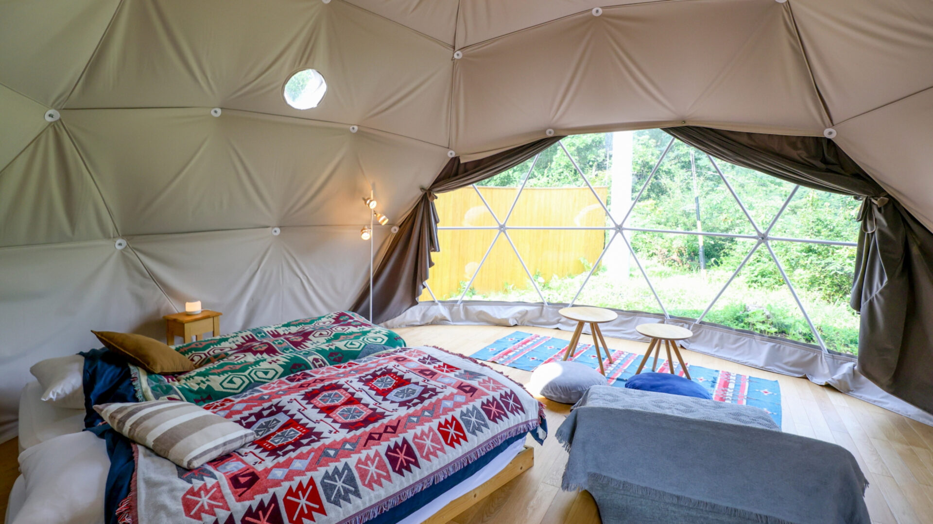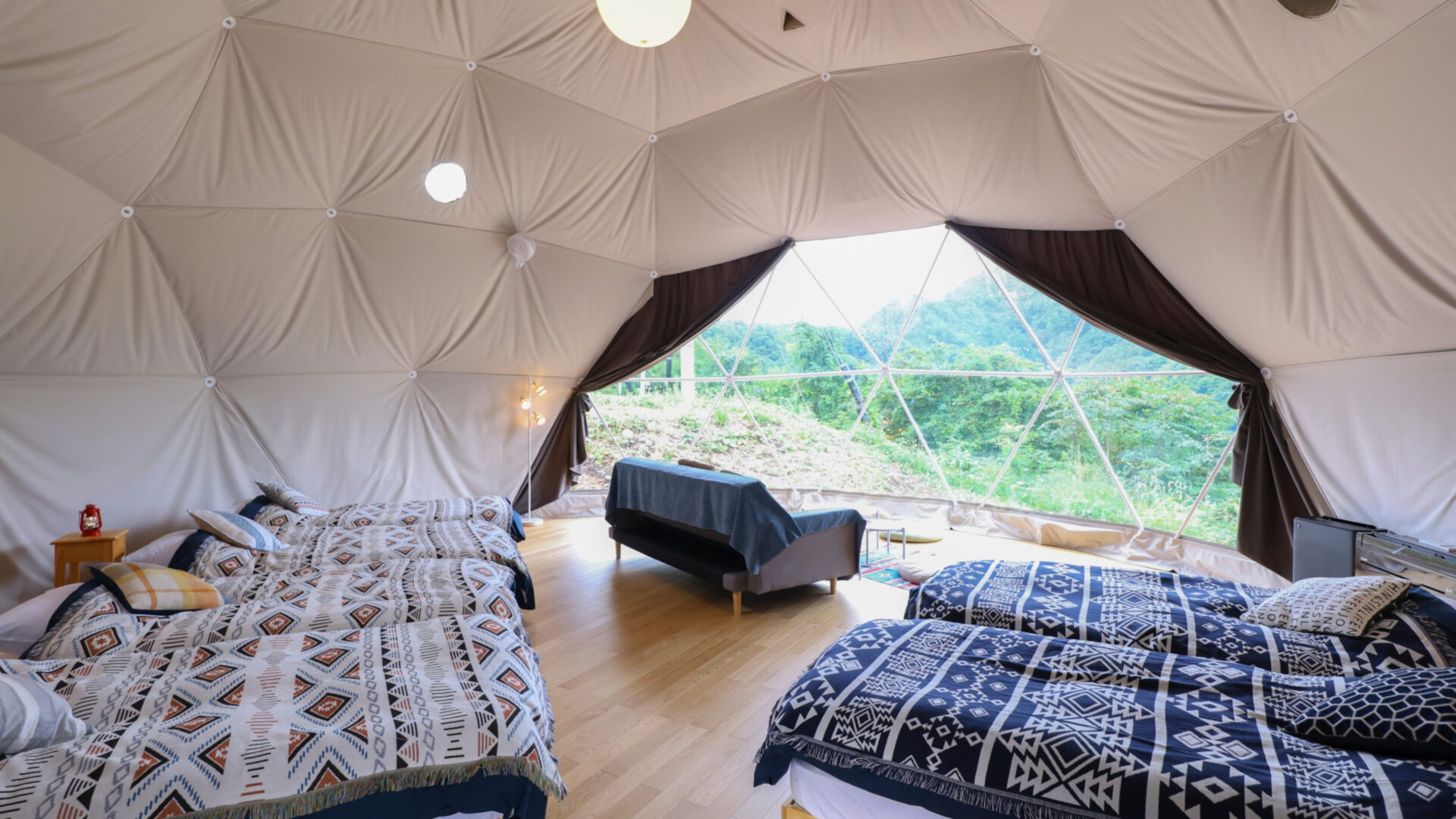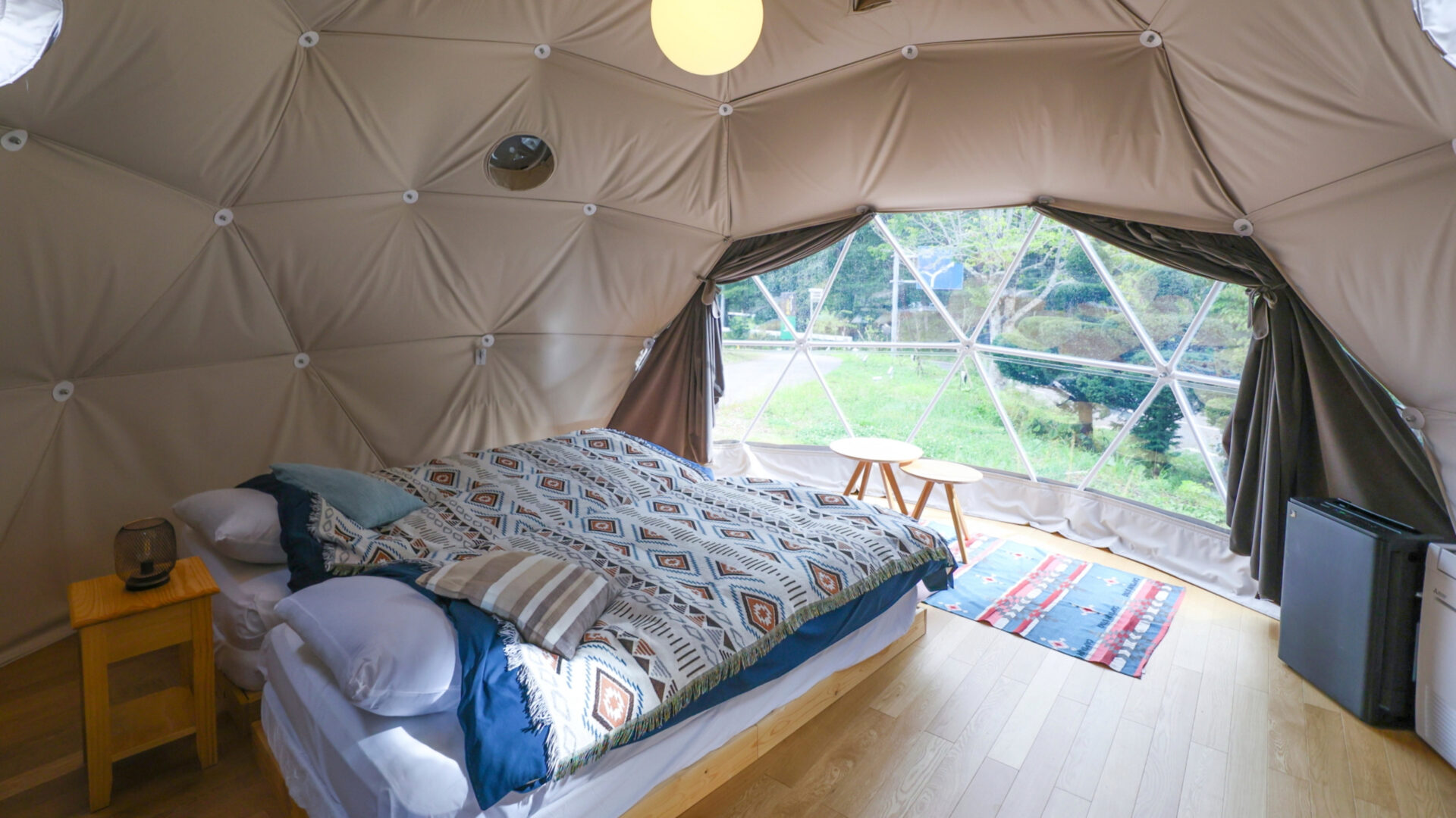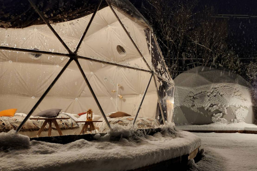 冷暖房完備のドームテントは、アウトドアの雰囲気を味わいながらも快適性を確保。