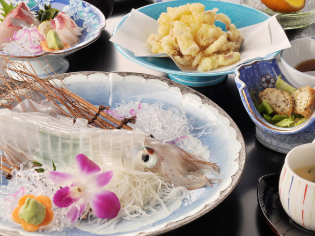食事は、レストランでの提供が基本となりますが、 予約制・先着順で利用できる半個室も3室用意されています。 周囲を気にせず、落ち着いて食事を楽しみたい方に選ばれている空間です (1組 2,000円)。 レストラン、半個室ともに海側に面し、 明るい時間帯には、玄界灘の穏やかな景色が窓の向こうに広がります。 ゆったりとした景色を眺めながら過ごす食事の時間は、 旅の流れを自然と穏やかにしてくれます。 料理は、佐賀ならではの食材を大切にした内容。 呼子名物のイカの活き造り、 佐賀牛、いかしゅうまい。 土地の味覚を中心に、素材の良さを活かした料理が、静かに並びます。 季節ごとに、魚や前菜には旬の食材が取り入れられ、 その時季ならではの味わいが添えられます。 華美な演出よりも、 食べ終えたあとに、心地よい満足が残ること。 そんな大人の感覚に寄り添う食事です。 ※ペット同伴ランチの実施状況については、最新情報を公式Instagramでご確認ください。