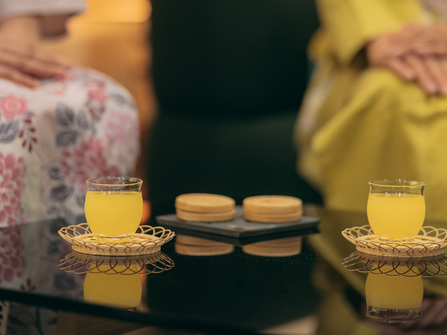 「東雲」「咲夜」「月待」ウェルカムサービスには、ニューサマーオレンジ餡のモナカと、