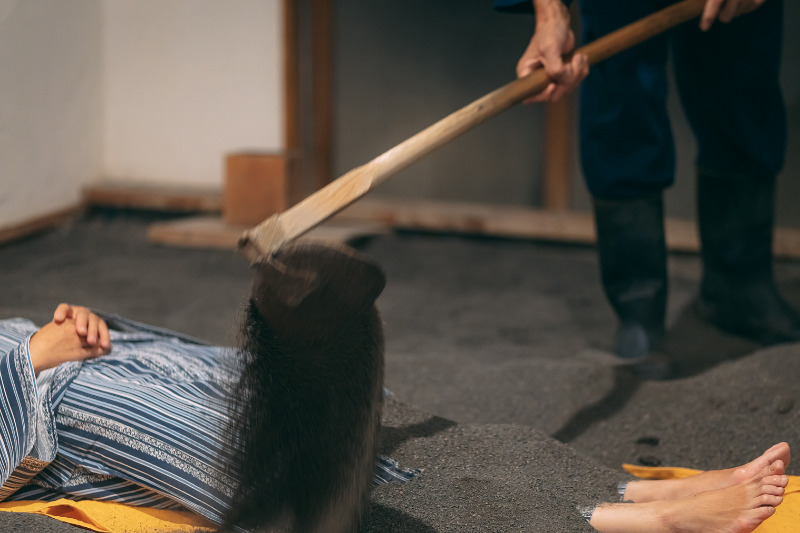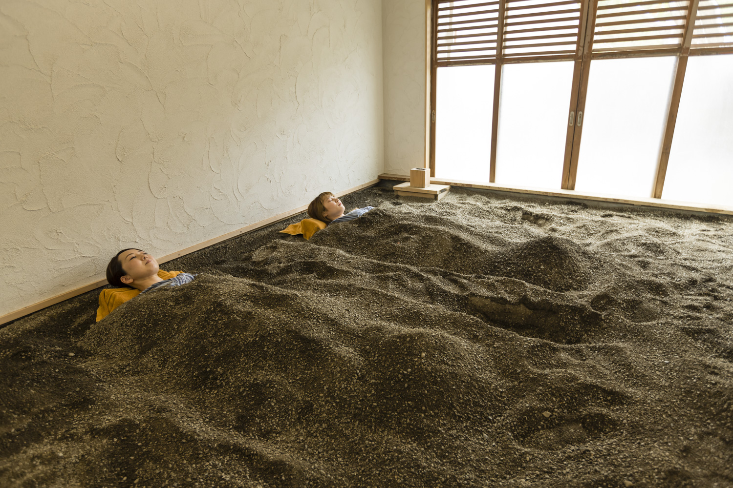 自家源泉の熱を利用した砂風呂体験。温泉熱で温められた砂に身を包まれ、