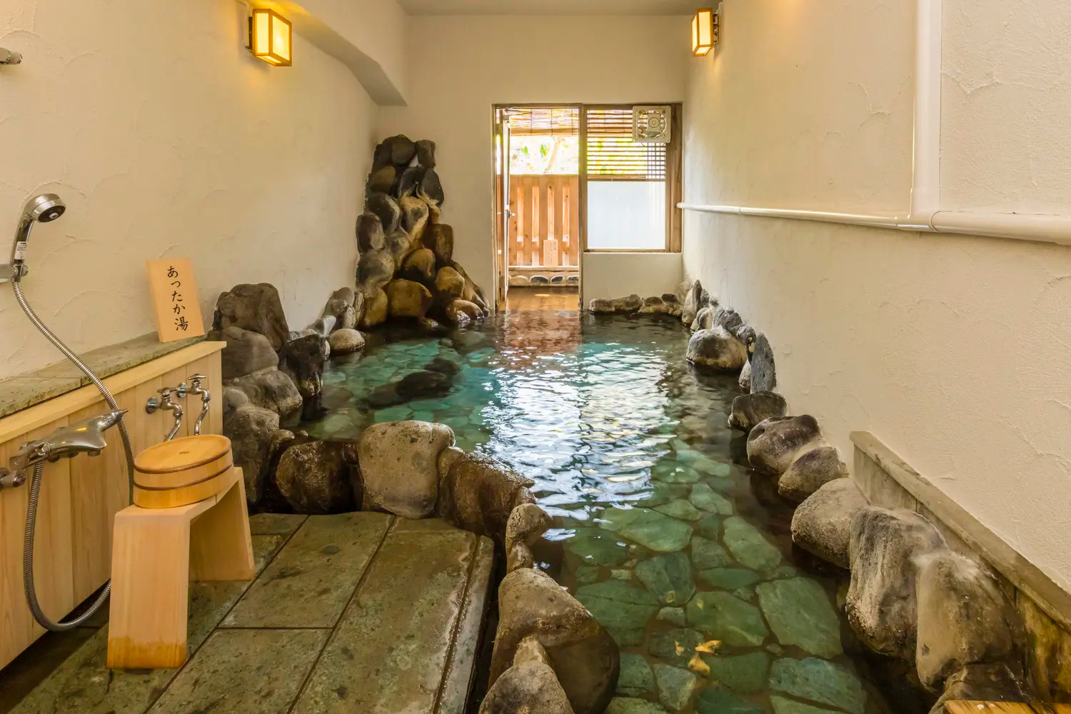 源泉かけ流しと砂風呂を楽しめる宿。駅徒歩 1分という便利さと、