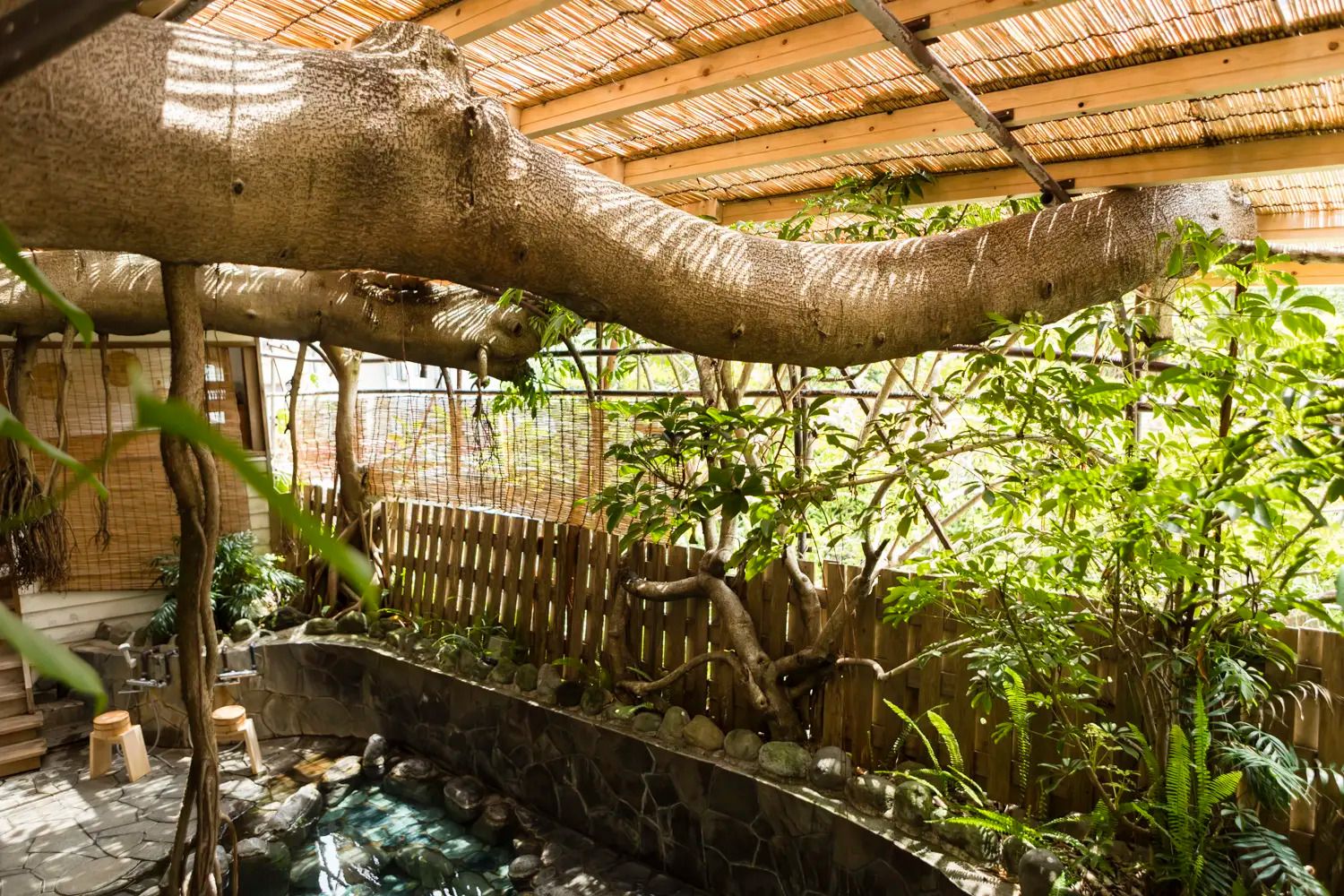 巨大なゴムの木が印象的な開放感あふれる露天風呂。