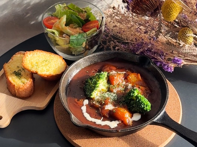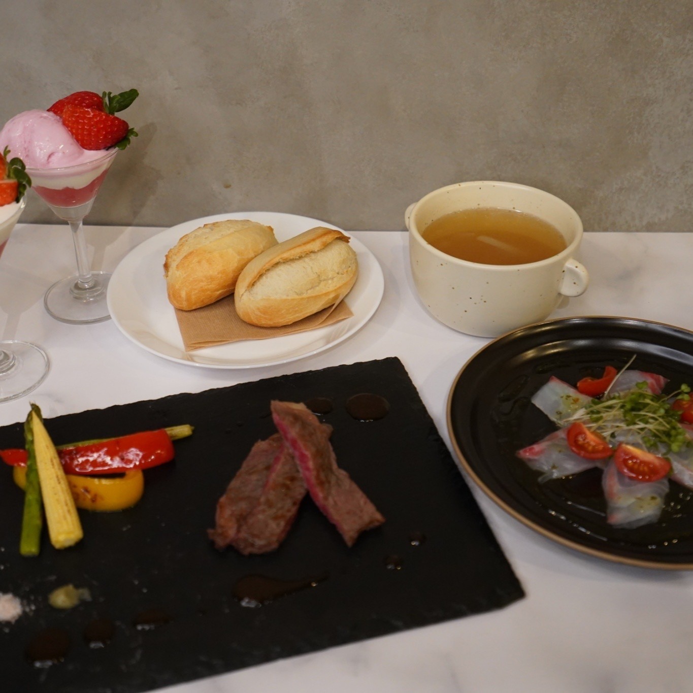 山梨県産牛のビーフシチューをはじめ、事前注文制のコース料理(ほうとうや牛肉料理など)、季節のフルーツパフェやアサイーボウルまで、幅広いメニューが揃います。