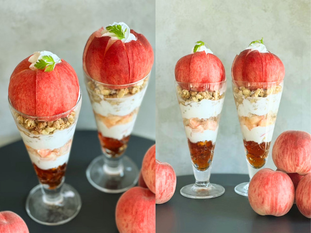 果実の季節には、桃やシャインマスカット、柿など、果樹園で収穫された旬のフルーツが主役に。