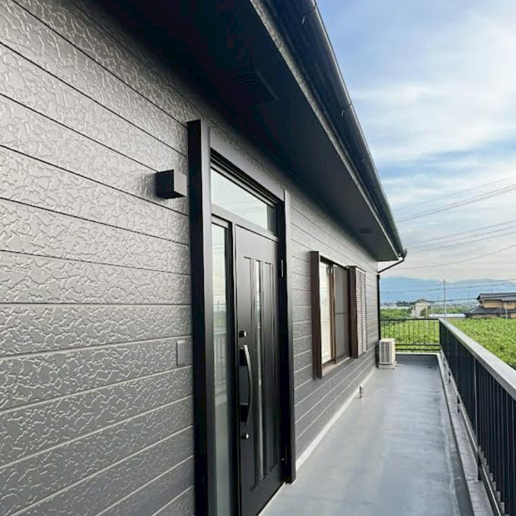 ぶどう畑の風景に溶け込むように佇む、黒灰色の重厚な外観。
